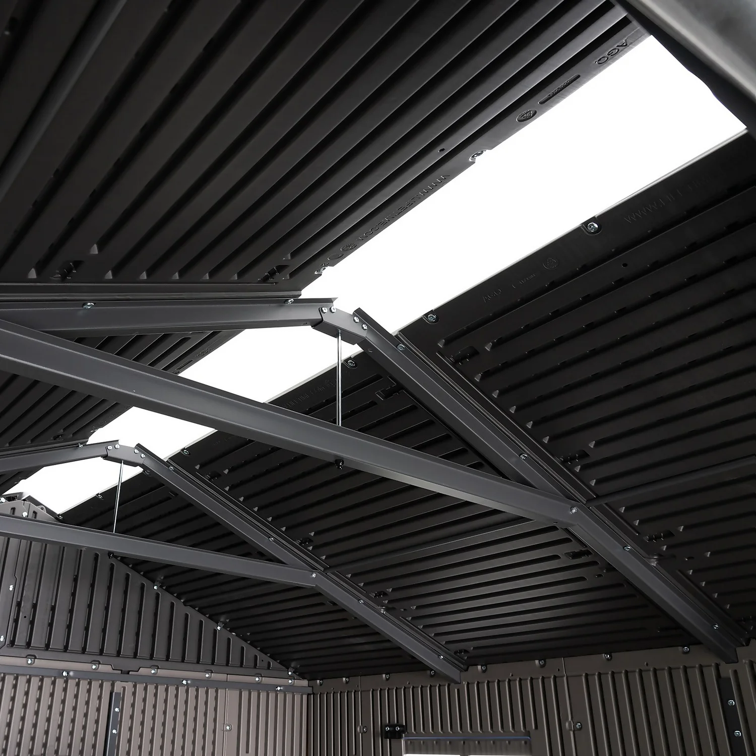 - Steep angle allows for quick drainage of rain and snow, and provides a spacious walk-around interior, heavy-duty steel trusses increase strength